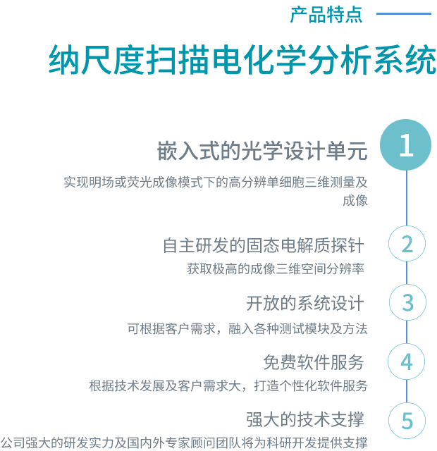 纳尺度扫描电化学分析系统基于扫描电化学池显微镜(SECCM)、离子电导显微镜(SICM)和扫描电化学显微镜(SECM)基本原理,结合自主研发的高灵敏电流检测、高分辨压电陶瓷移动及高精准反馈模块一体化设计,可以对材料的电化学性能、光学性能及三维形貌等进行高空间分辨成像,从而为理解电化学过程机理,遴选电化学材料等提供研究工具;还可以对单个活细胞在生理过程下多种物理参数(形貌、体积、表面电荷分布、模量等)及电生理信息的变化进行高空间分辨成像。